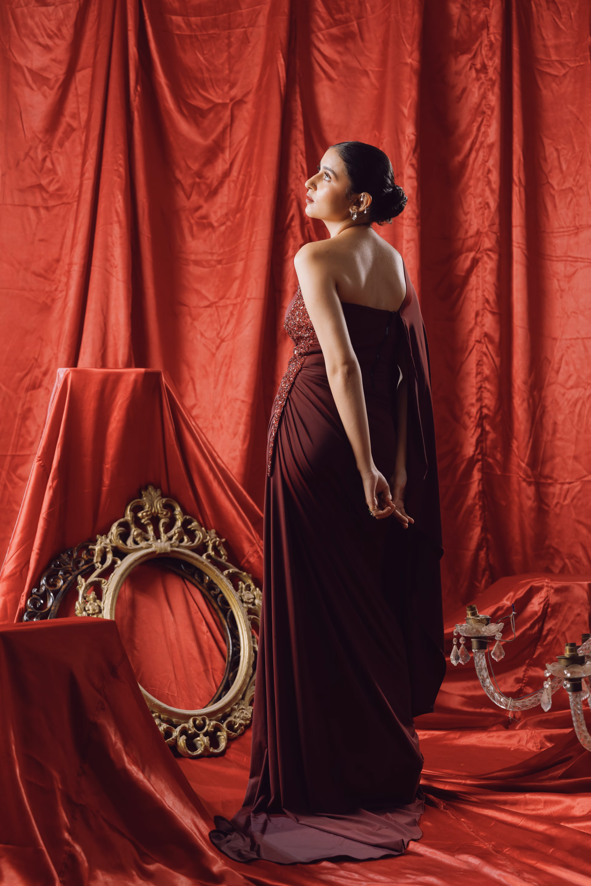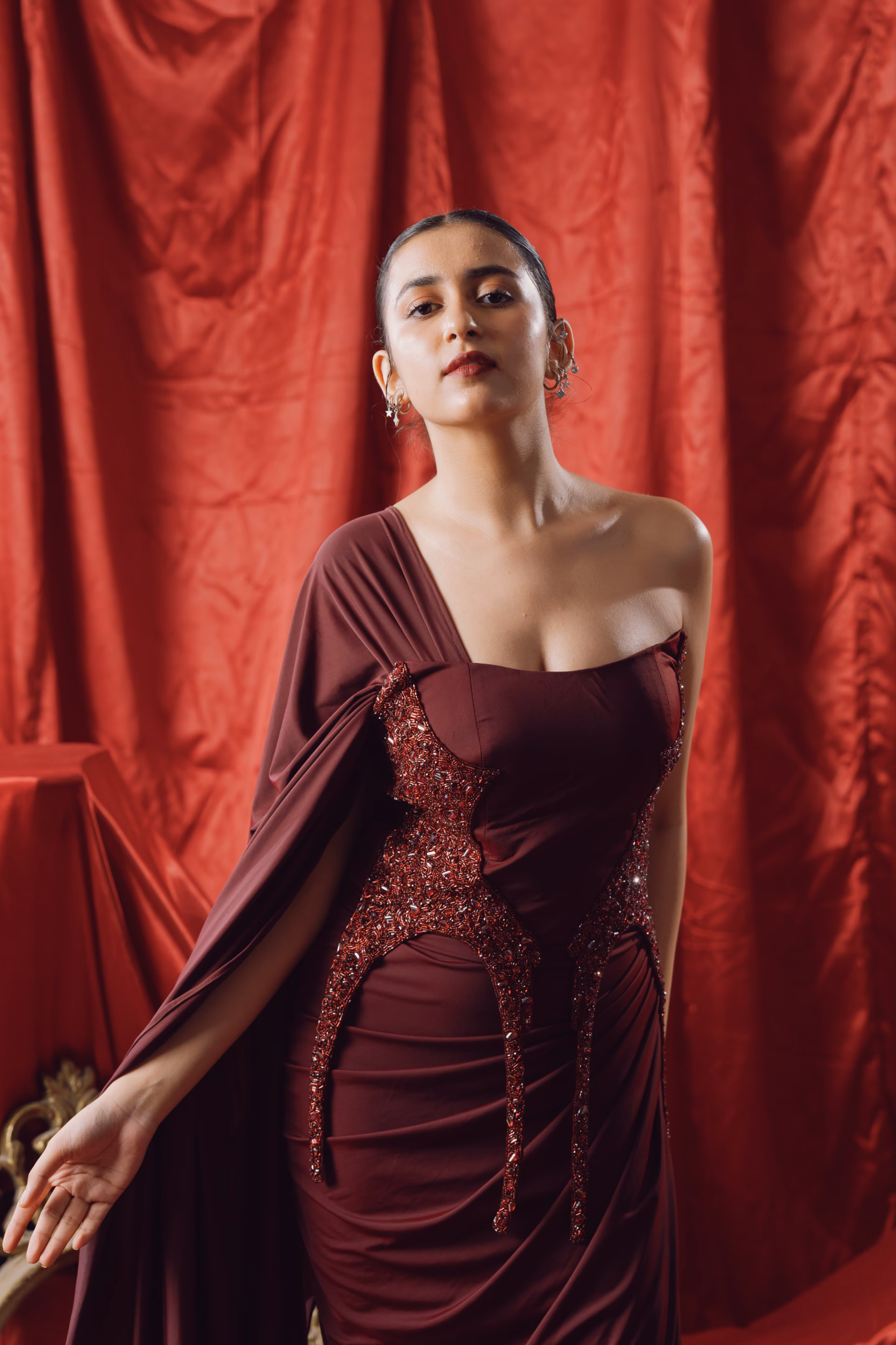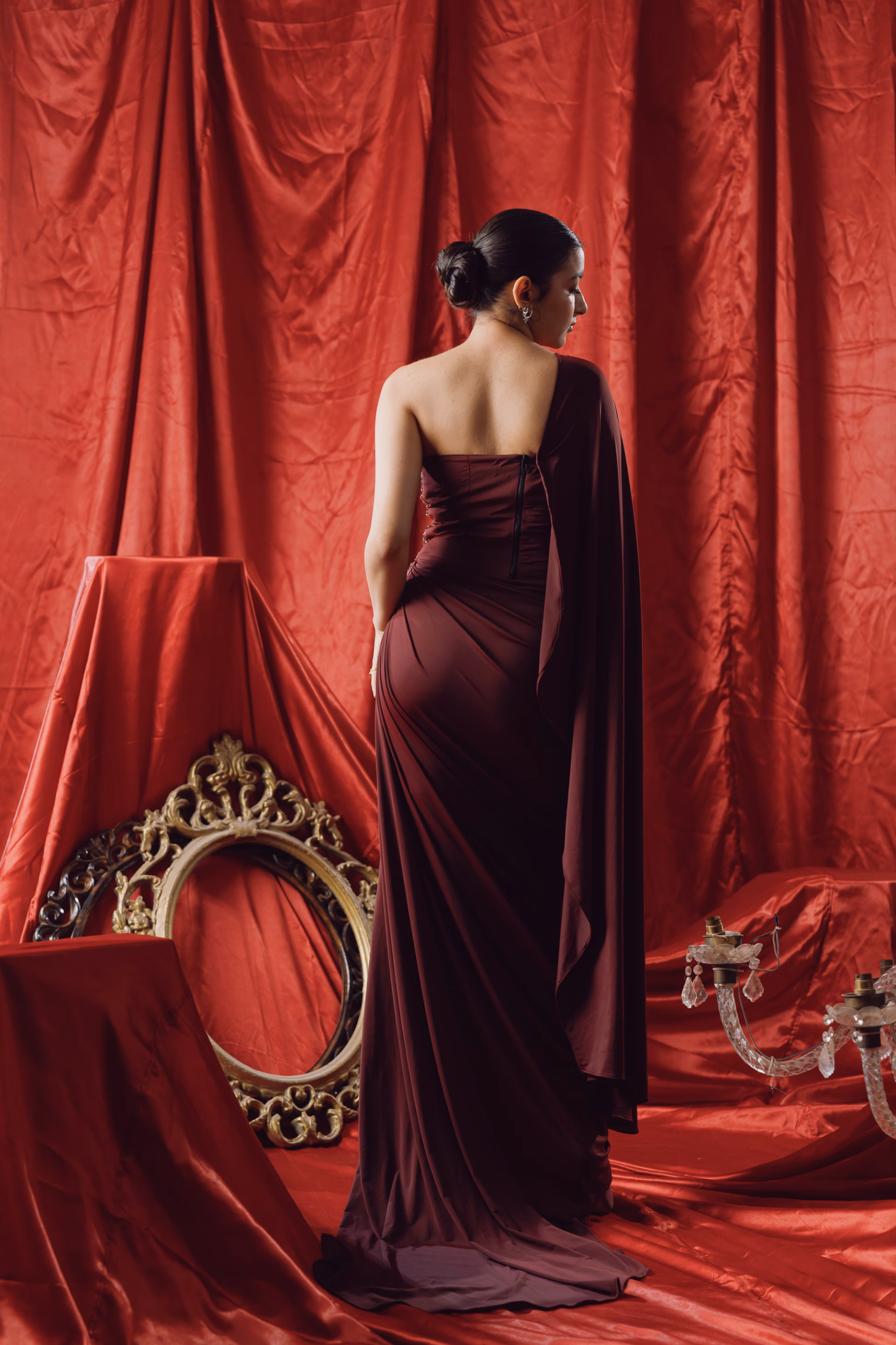 This asymmetrically draped saree in maroon lycra reimagines traditional draping through a sculptural lens. Featuring a dramatic diagonal drape that falls to ankle length in the front and extends into a flowing trail at the back, the silhouette offers both movement and modernity. The design includes an attached pallu, seamlessly integrated for ease and structure. Hand-dyed using Azo-free dyes, each piece carries unique tonal variation while embracing a conscious approach to textile craft. A signature piece from the Genesis Pre-Fall 2025–26 collection, where heritage form is translated into contemporary expression.