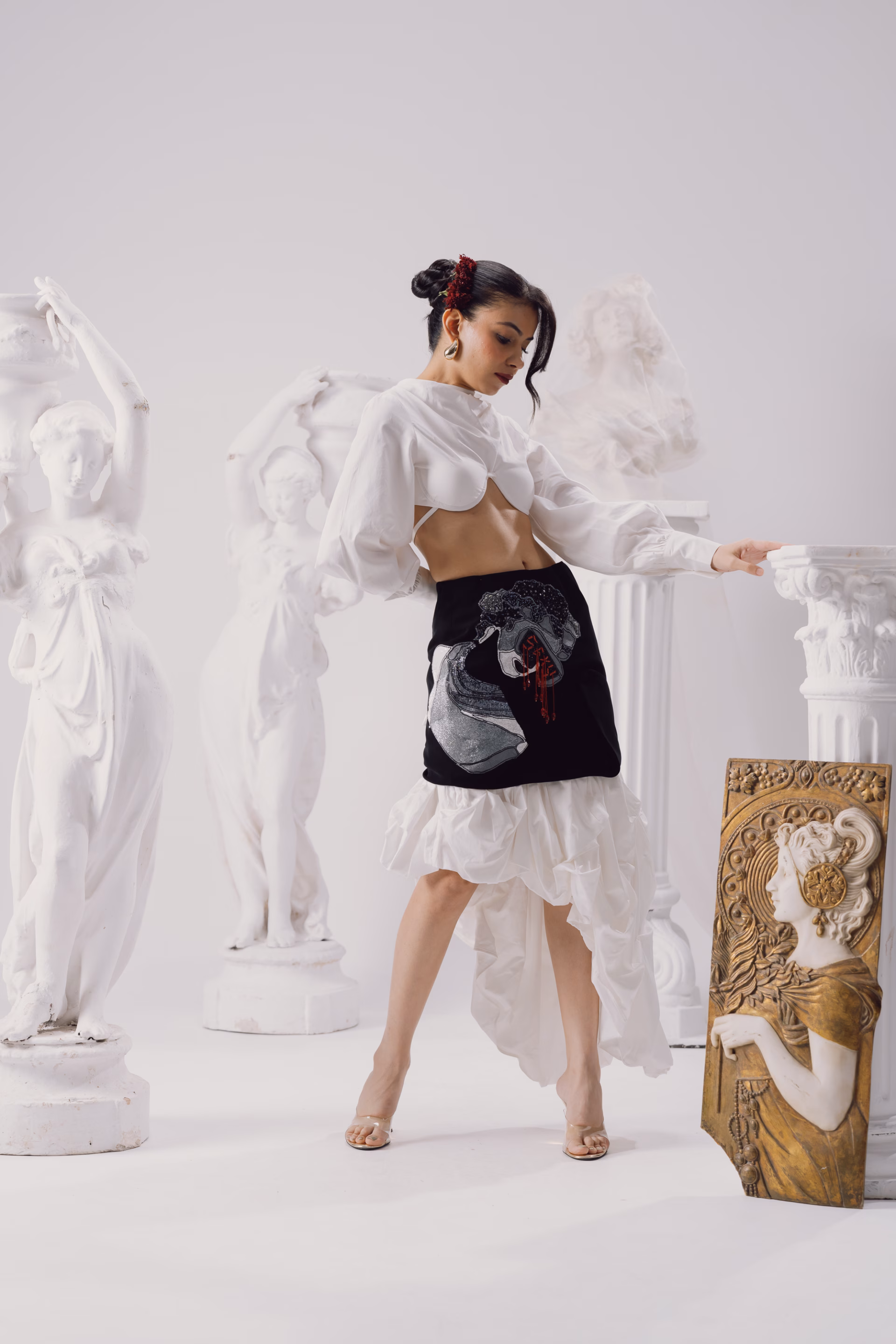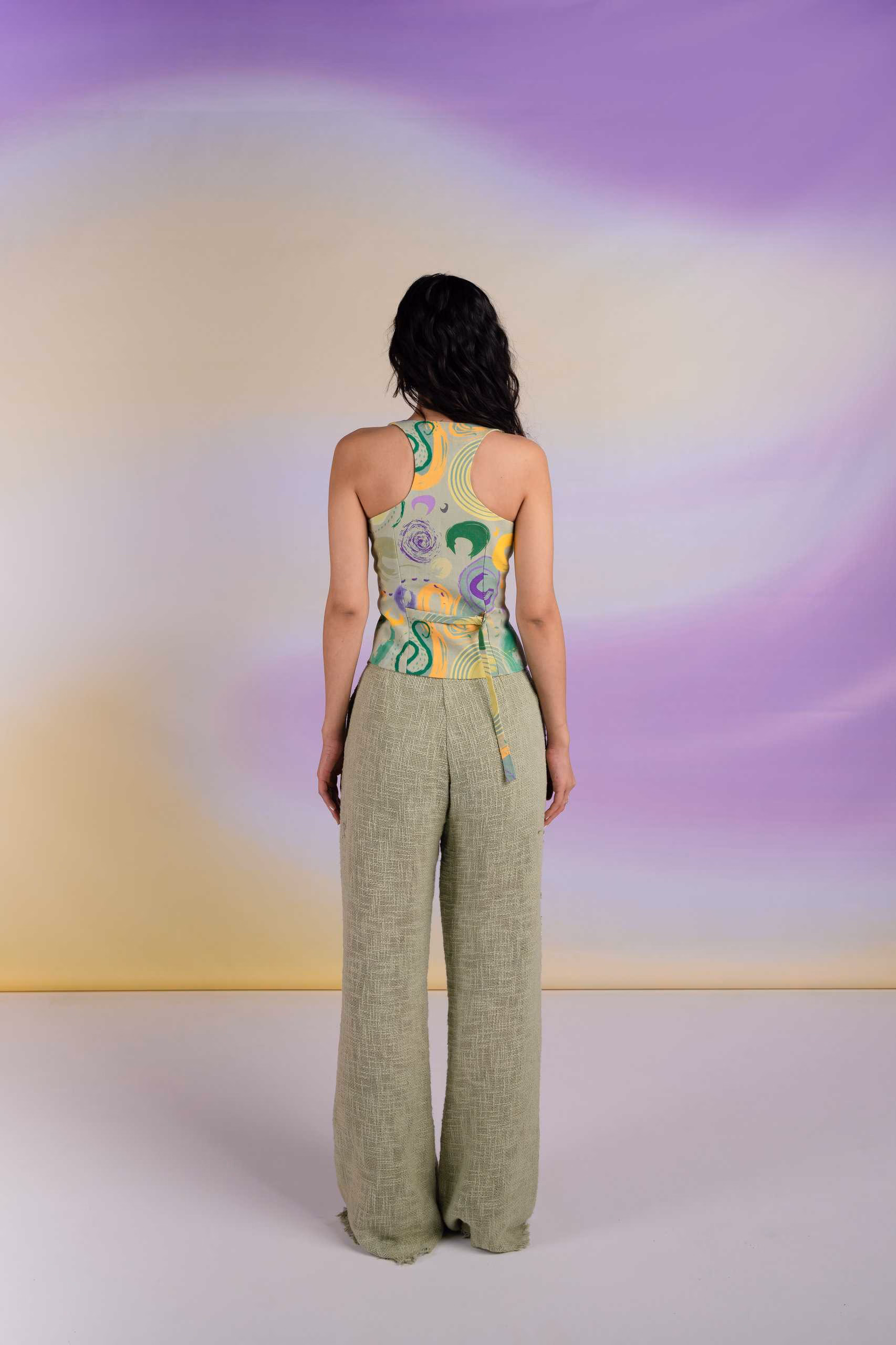 A relaxed-fit silhouette designed for fluid movement, this low-waist pant features a double curtain drape detail that adds sculptural volume and versatility. The style includes side pockets, a clean side opening, and gold eyelet accents that elevate the utilitarian edge. A detachable brown nylon rope belt, finished with baroque pearl detailing, completes the look. This design can also be customized to a high-waisted fit if requested in advance. A standout piece from the Genesis Pre-Fall 2025–26 collection, it blends adaptable form with statement detailing.