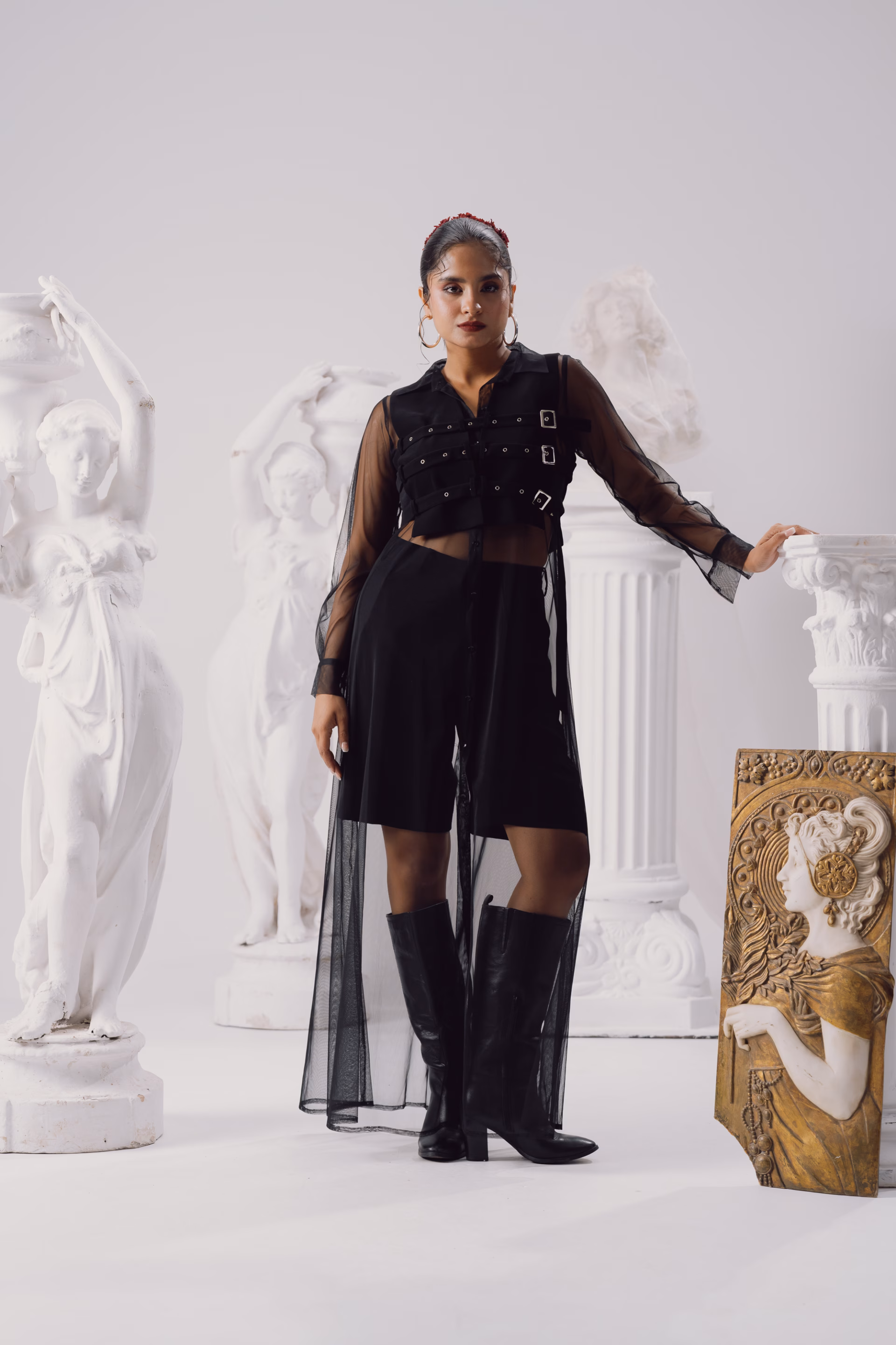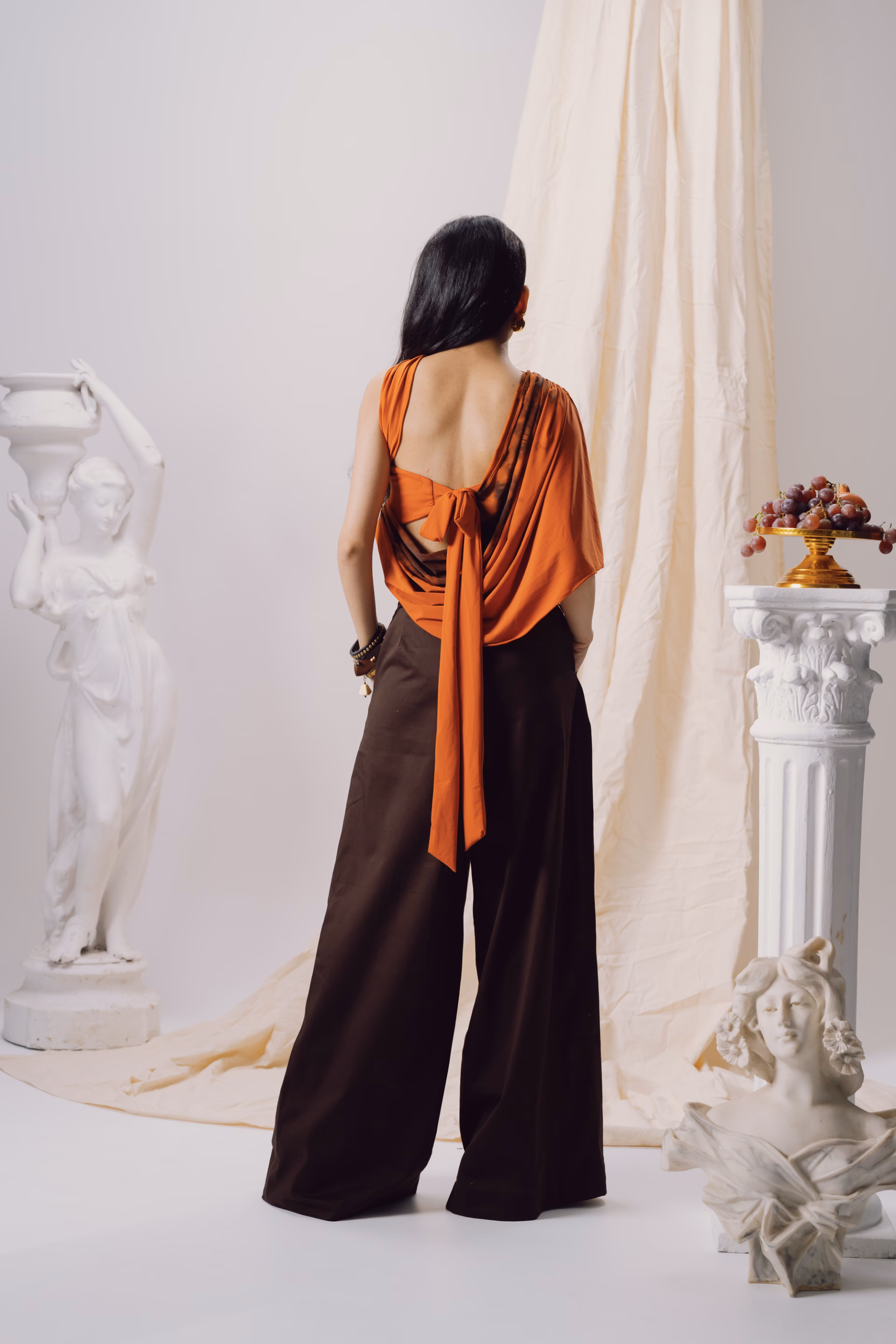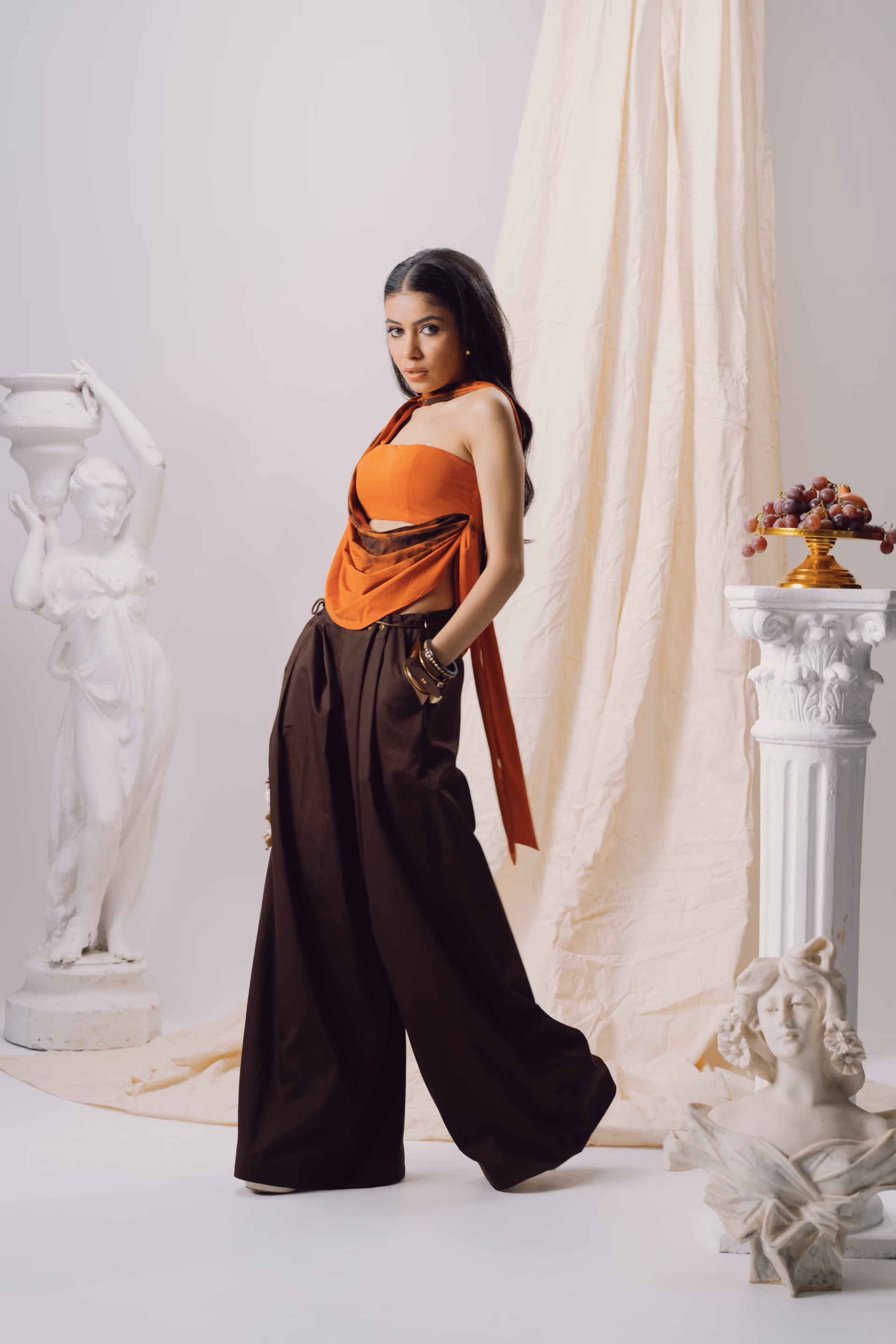 A relaxed-fit silhouette designed for fluid movement, this low-waist pant features a double curtain drape detail that adds sculptural volume and versatility. The style includes side pockets, a clean side opening, and gold eyelet accents that elevate the utilitarian edge. A detachable brown nylon rope belt, finished with baroque pearl detailing, completes the look. This design can also be customized to a high-waisted fit if requested in advance. A standout piece from the Genesis Pre-Fall 2025–26 collection, it blends adaptable form with statement detailing.