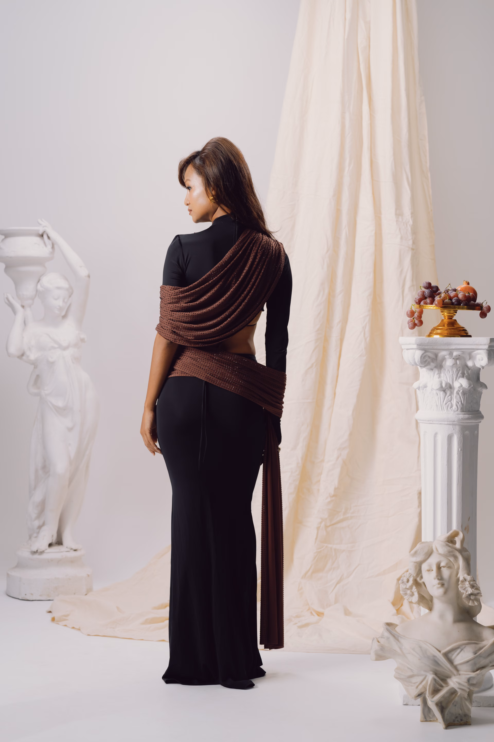 A sculpted base of black lycra forms this sleek fishcut skirt, designed to contour the body and flare gently toward the hem. Layered over it is a criss-cross drape in brown lycra, delicately embellished with tonal black rhinestones that catch the light with subtle shimmer. The drape extends into a wrist-length stole, blending structure and fluidity in a single gesture. A striking ensemble element from the Genesis Pre-Fall 2025–26 collection, where textural layering and silhouette harmony take center stage.