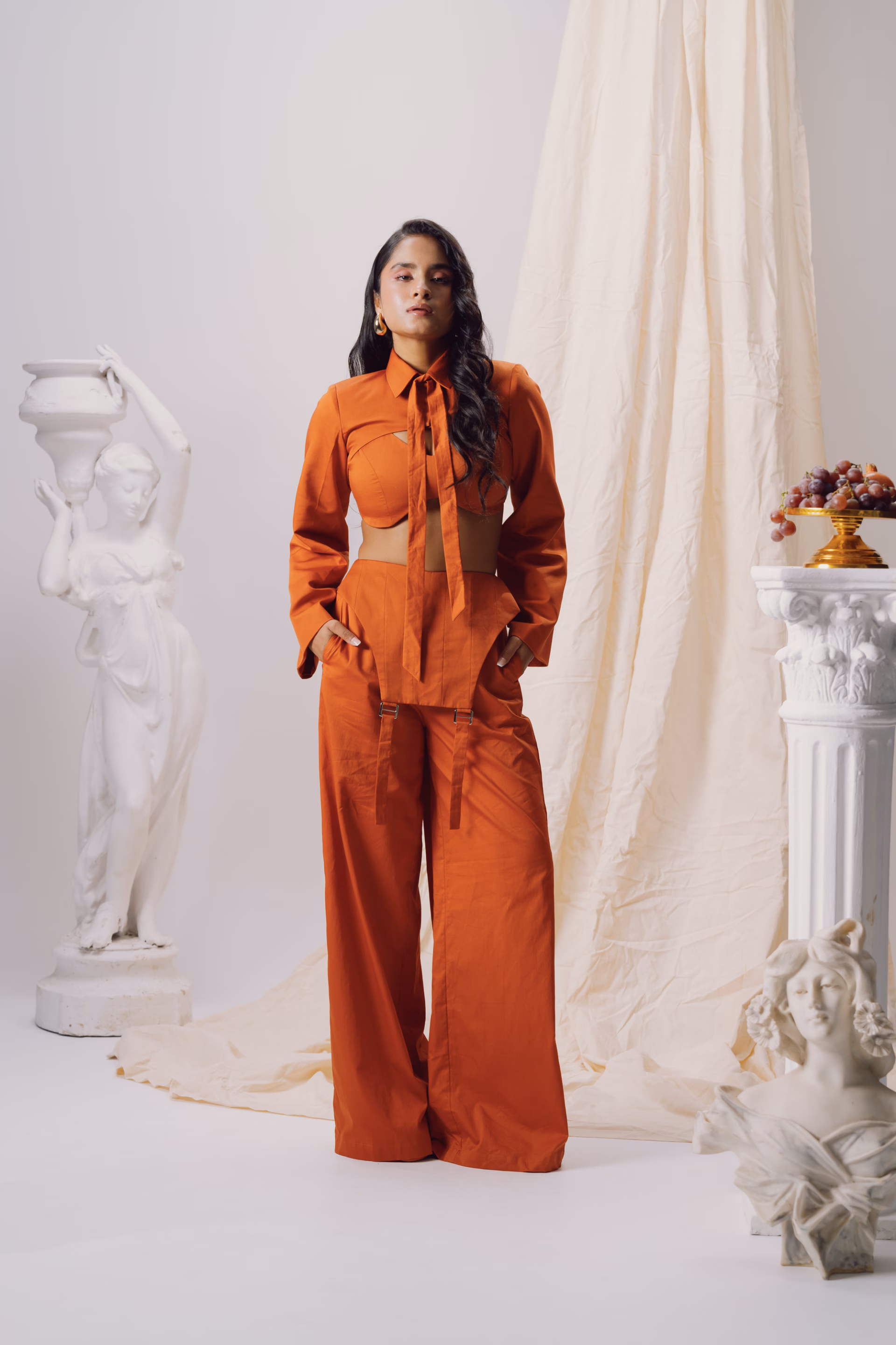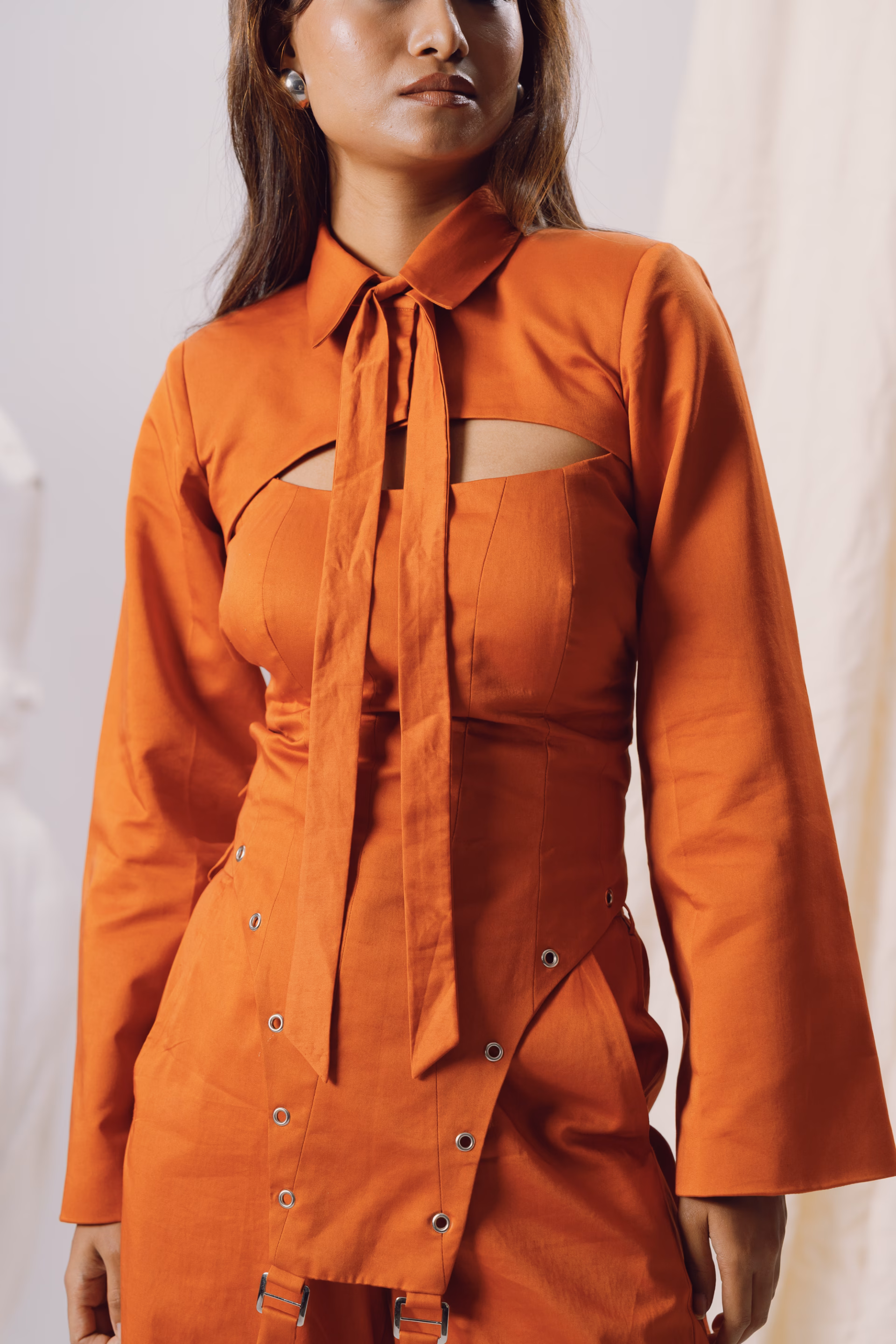 Known as the orange overlay or bullero, this cropped layer is tailored in glaze cotton fabric and features a front hook opening for a clean, minimal finish. paired with a tie. Designed to pair effortlessly with scarves or structured separates, it serves as a versatile styling piece. Rooted in the modern layering codes of the Genesis Pre-Fall 2025–26 collection, it blends understated elegance with functional simplicity.