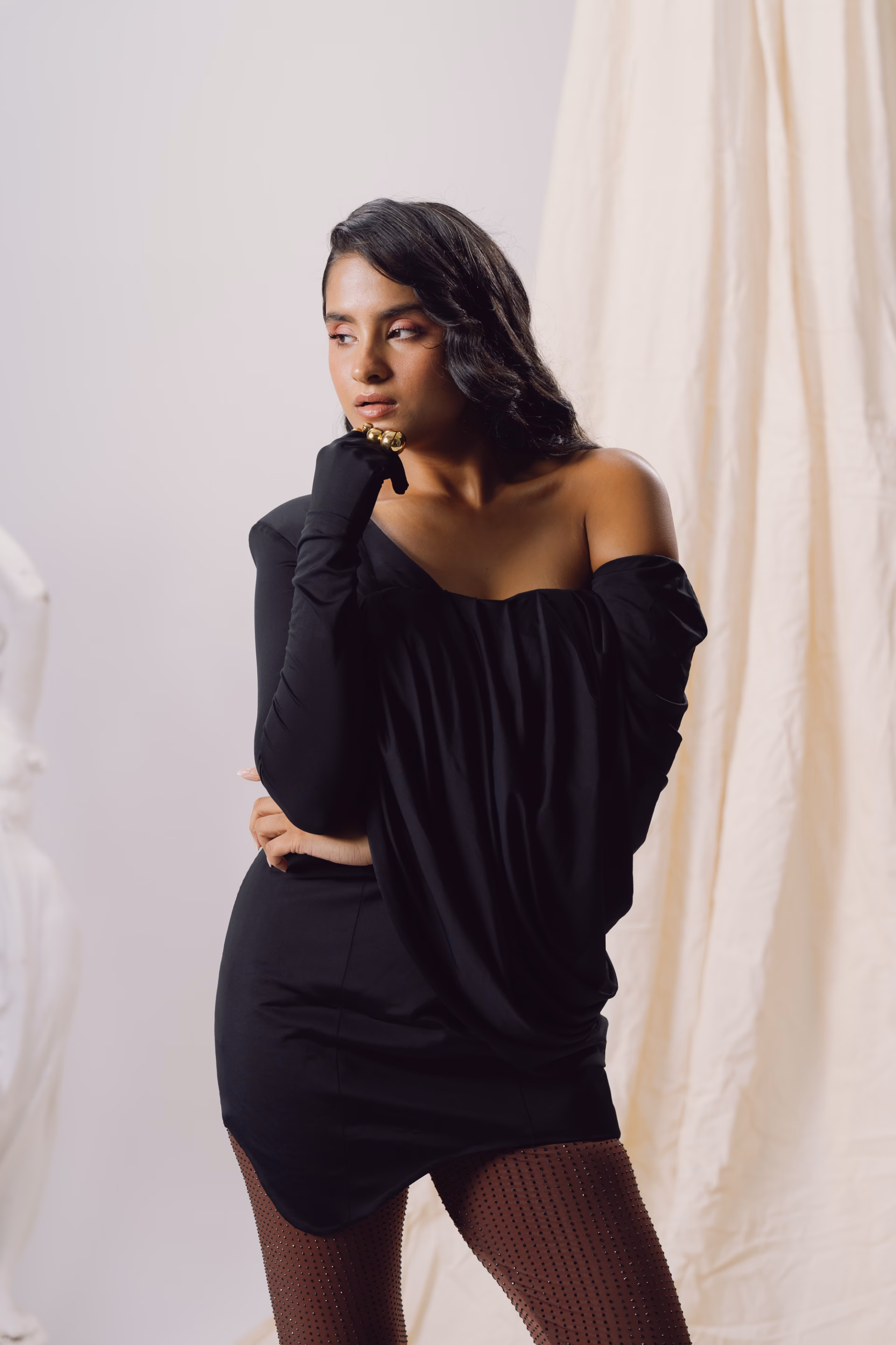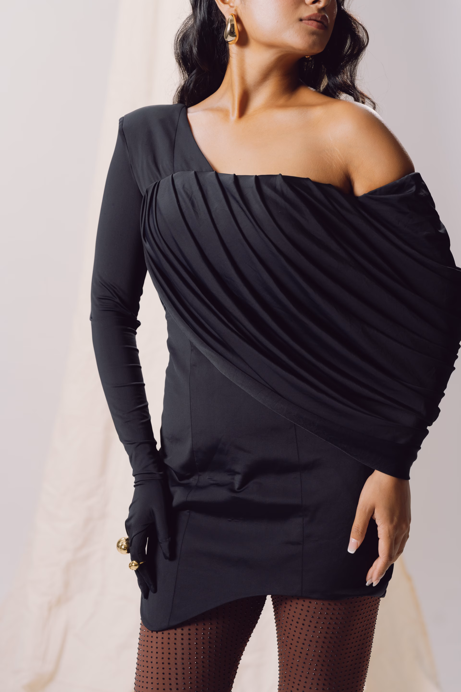 This one-shoulder bodycon dress in black lycra explores the tension between structure and softness. Featuring a sculpted glove detail and bold shoulder padding on one side, the silhouette is balanced by a cascading ripple-effect drape on the other, creating a fluid counterpoint. The S-curve hemline enhances the asymmetry and adds dynamic movement. A signature piece from the Genesis Pre-Fall 2025–26 collection, it blends precision tailoring with expressive draping.