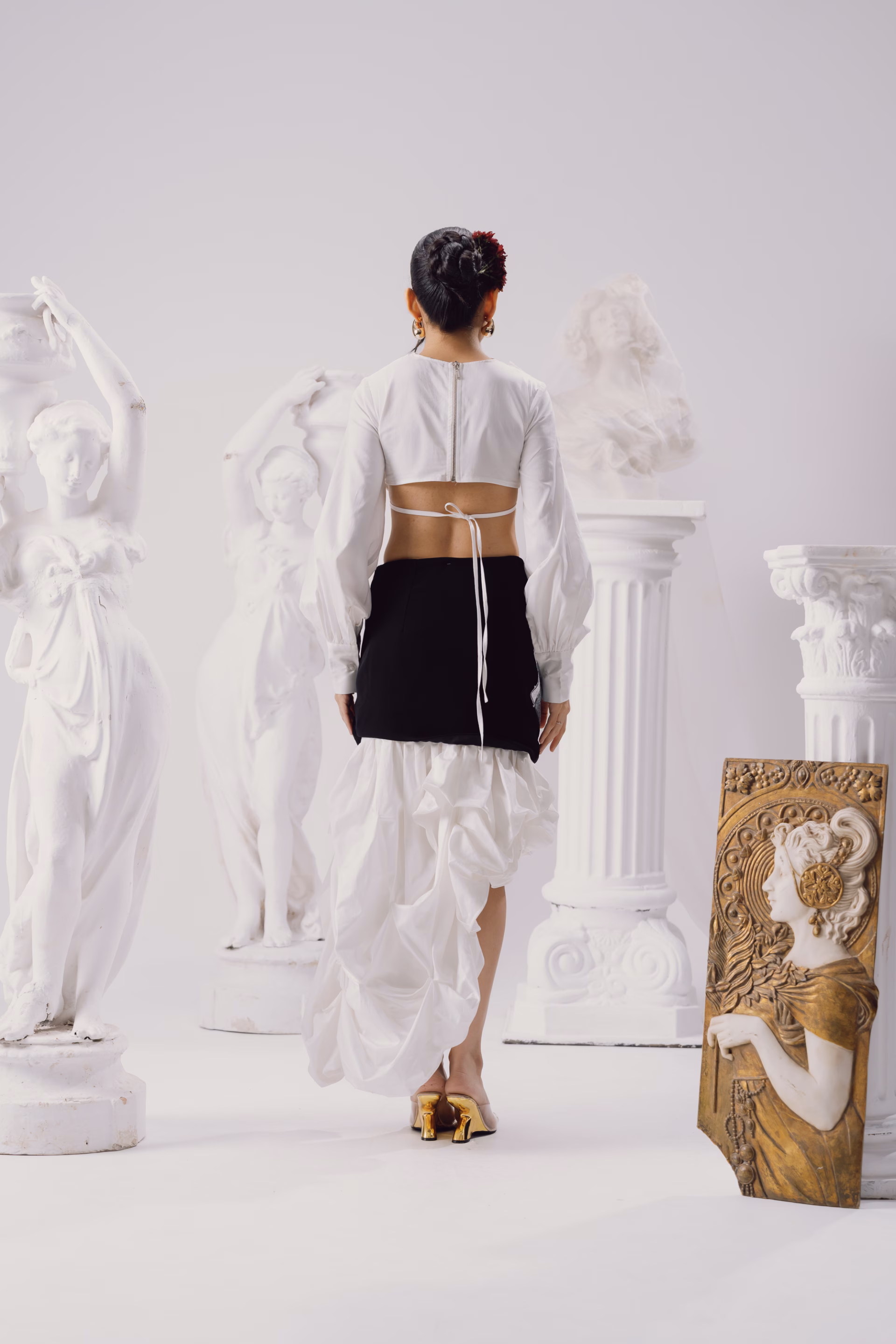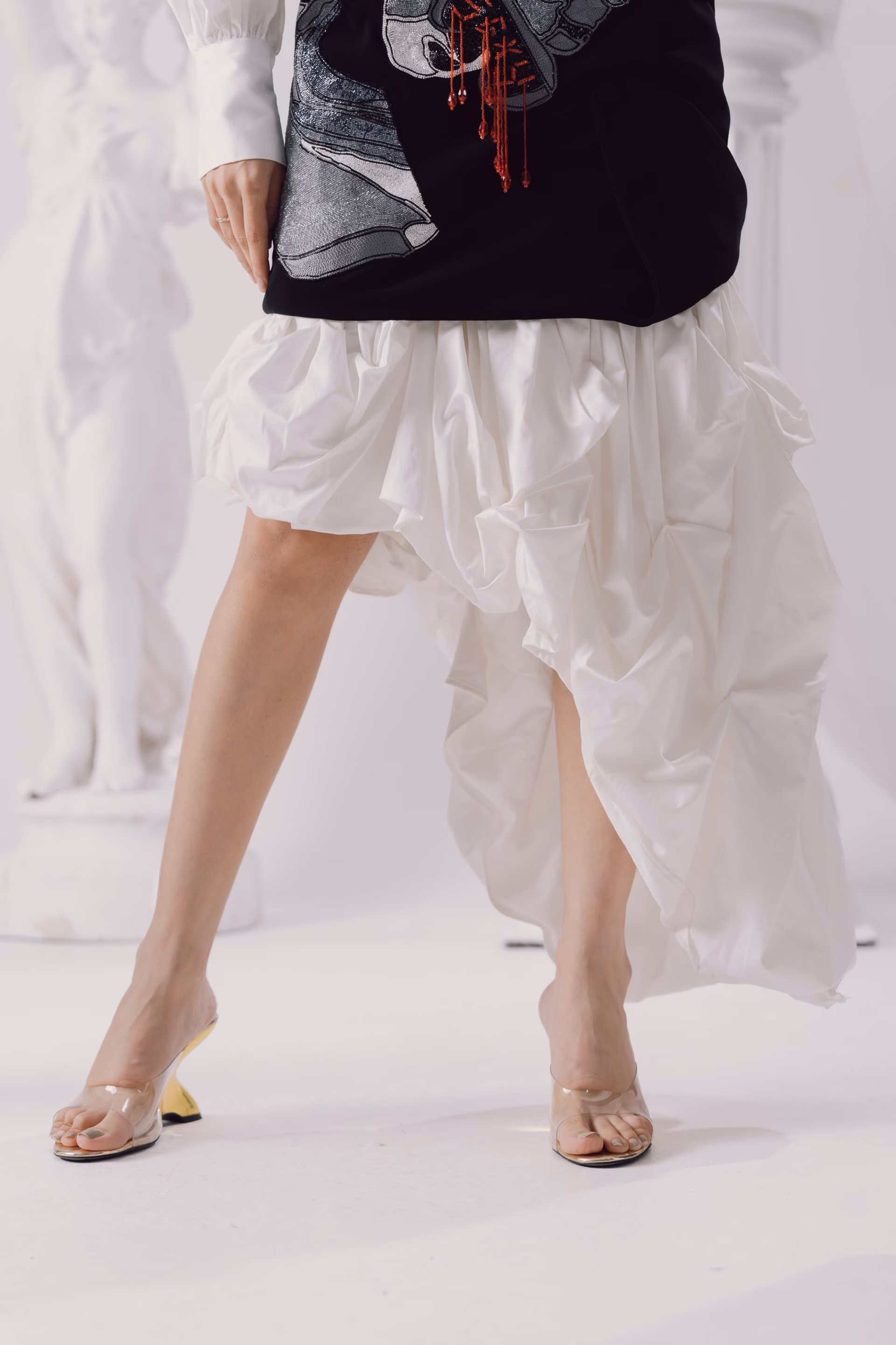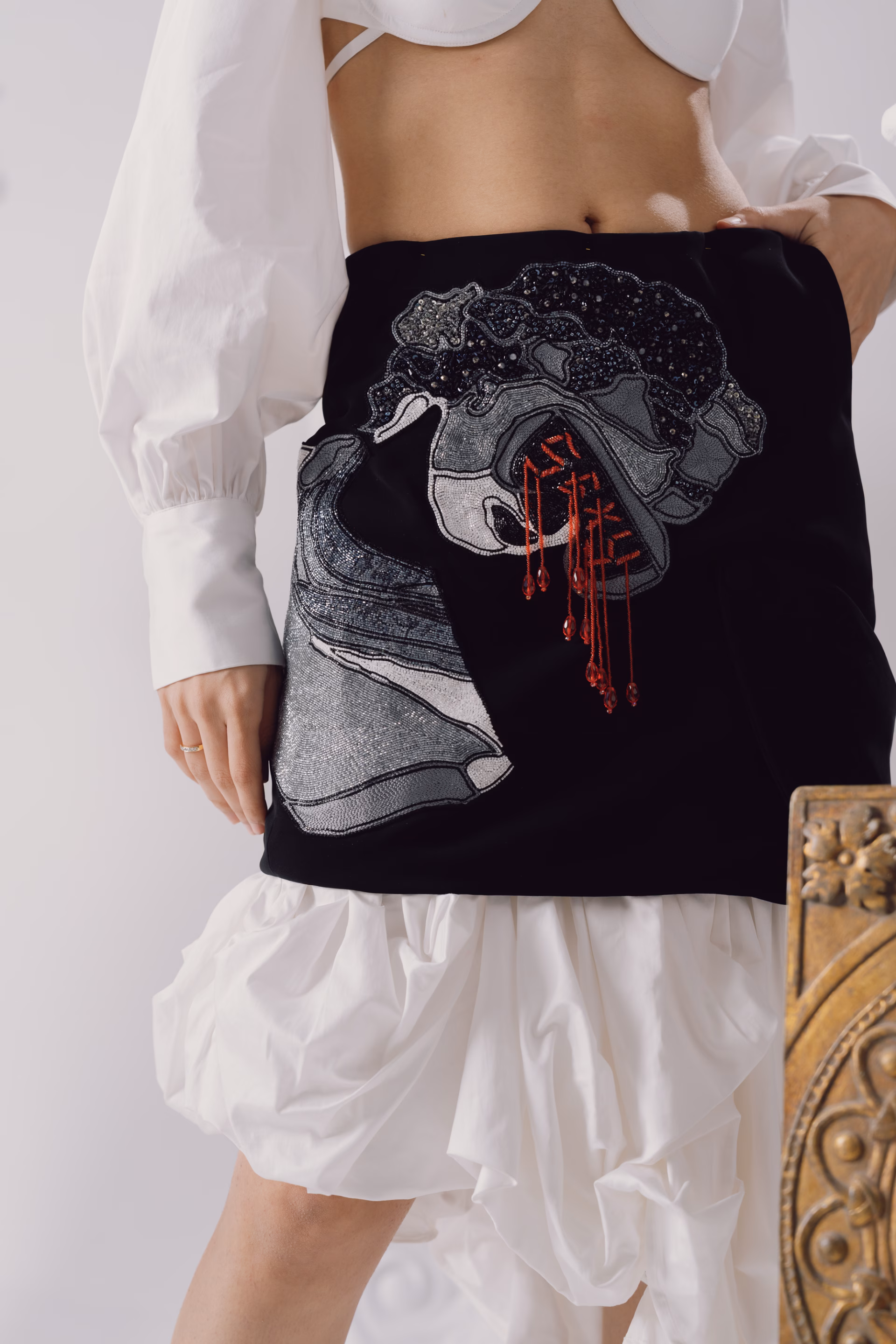 Intricate multi-media hand embroidery with bold red accents brings visual drama to this look, embodying the bold aesthetic of the Genesis Pre-Fall 2025–26 collection. A black skirt in viscose-blend fabric features an openable flap detail, adding structure and versatility. The ensemble is finished with an asymmetrical bubble hem crafted from glazed cotton, offering sculptural volume and fluid movement from day to night. Each piece requires approximately 10 hours of hand embroidery, highlighting the detailed craftsmanship central to the collection.