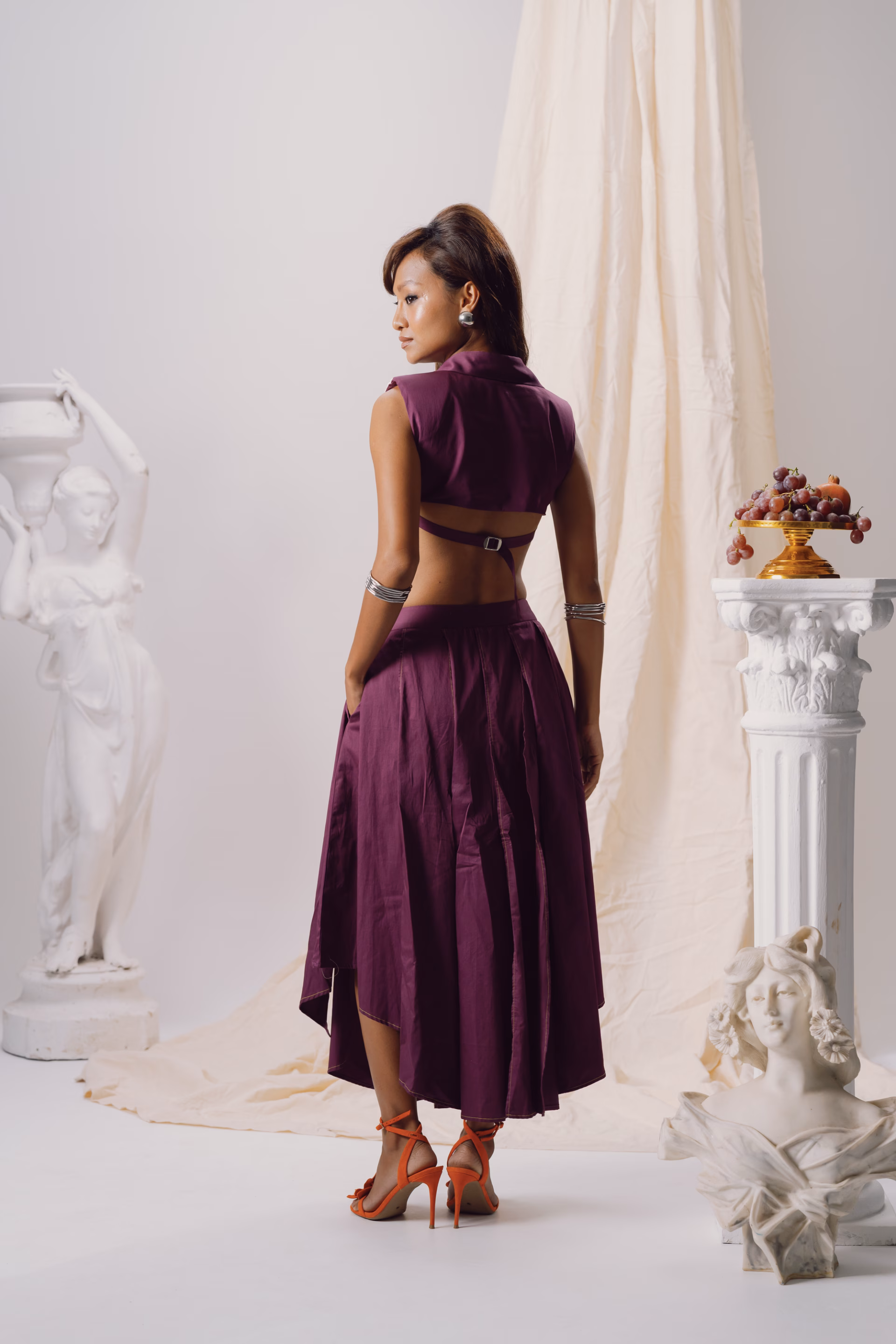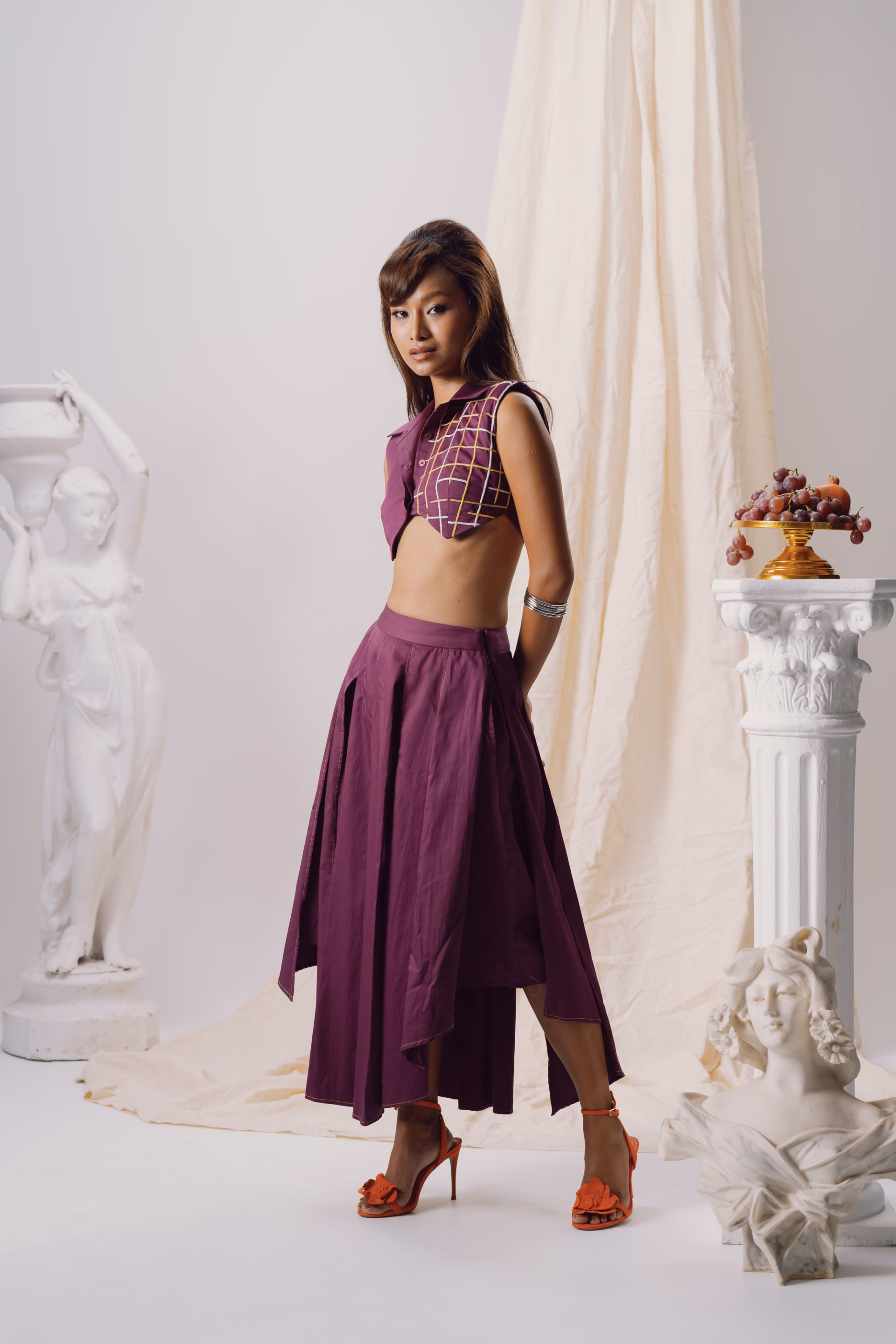 Tailored in structured glaze cotton, this cropped shirt features sharp power shoulders and a clean collar neckline, creating a bold and defined silhouette. The back is adjustable with a belt and buckle detail, allowing for a personalized fit. Finished with 3D cord embroidery in rugged check patterns, the surface offers a tactile, workshop-inspired finish. A standout from the Genesis Pre-Fall 2025–26 collection, where structural tailoring and artisanal texturing collide with precision. Each piece requires approximately 8 hours of hand embroidery, highlighting the detailed craftsmanship central to the collection.