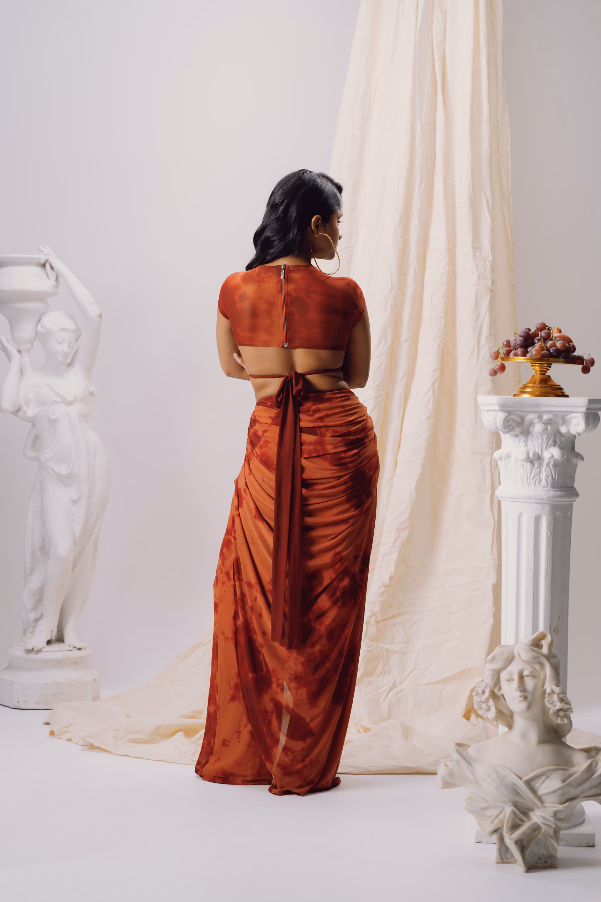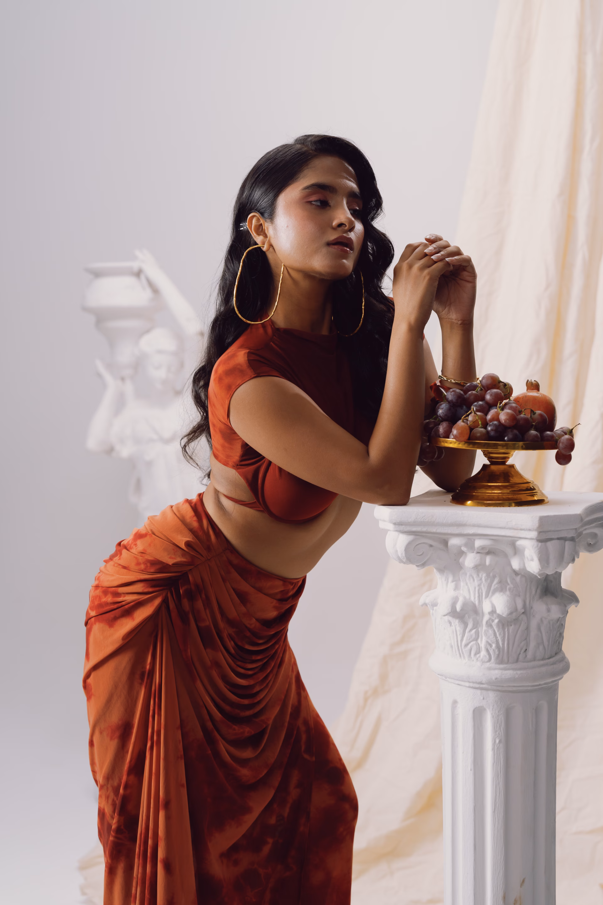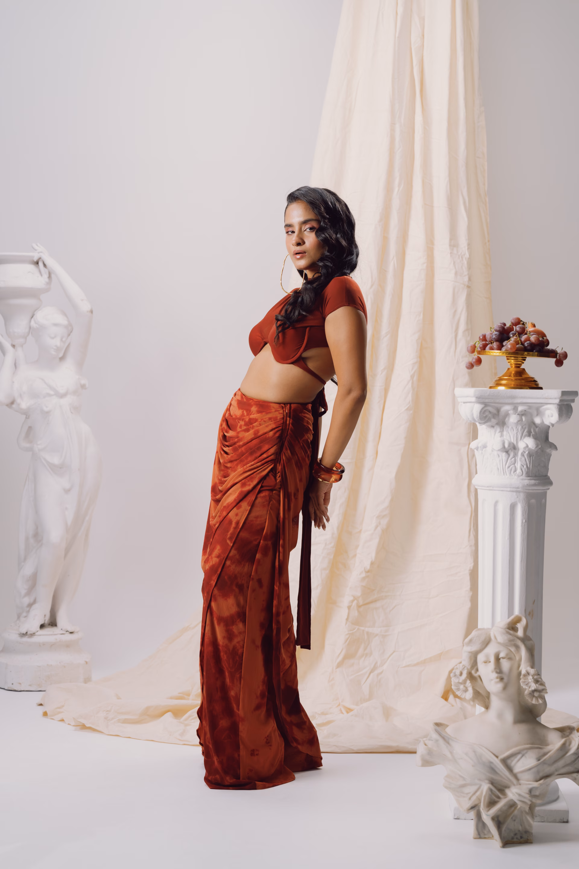 These stretchable mesh pants are designed with a sleek, semi-sheer silhouette, featuring short lining for coverage and comfort. Overlaid with an asymmetrical, hand-draped skirt panel, the piece adds sculptural movement and visual depth. Rendered in a maroon-orange tie-dye, each layer is hand-dyed using Azo-free dyes, resulting in unique tonal variations that embrace natural imperfection. A standout piece from the Genesis Pre-Fall 2025–26 collection, it blends fluidity with function, offering a bold reinterpretation of contemporary layering.