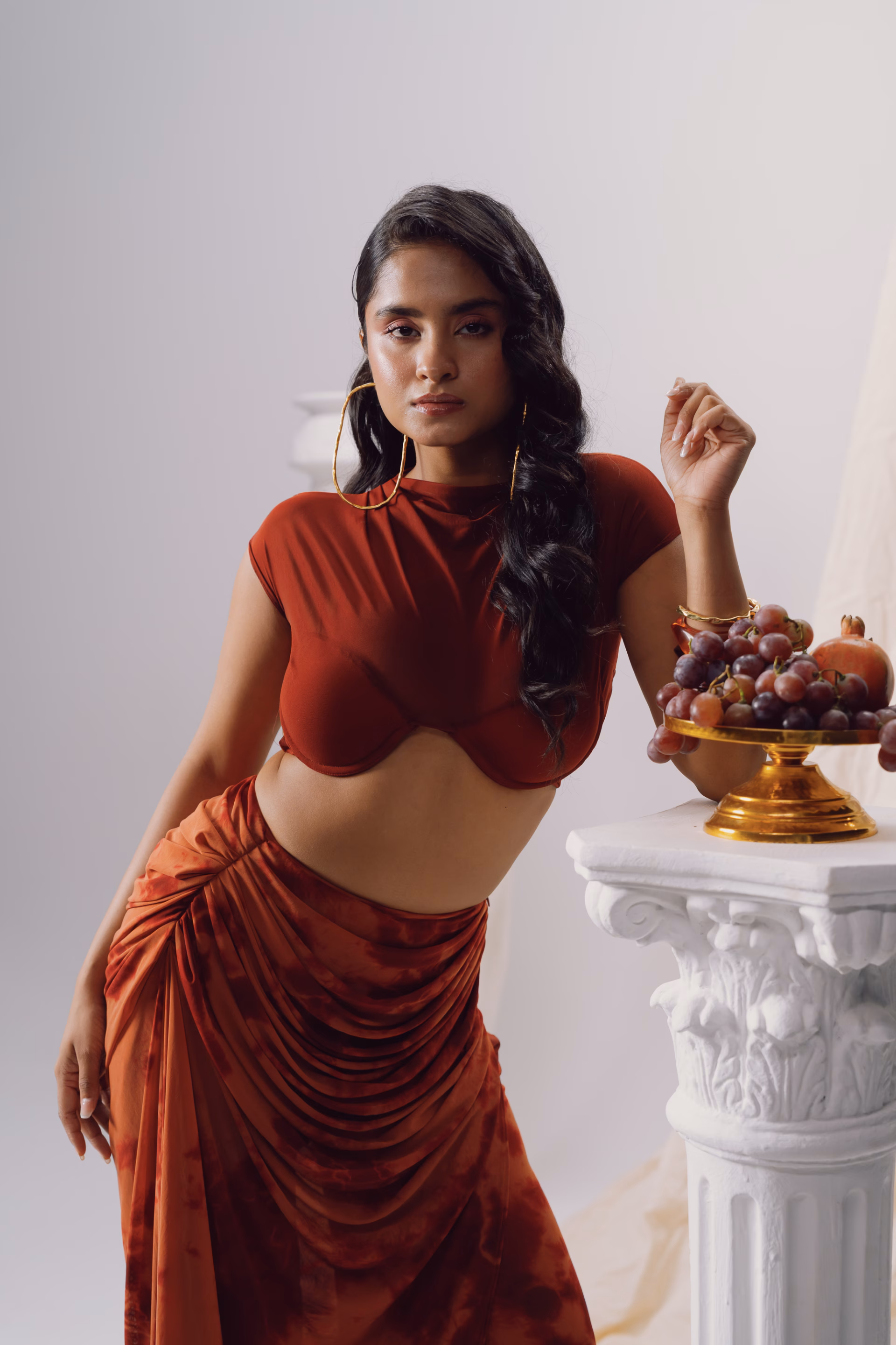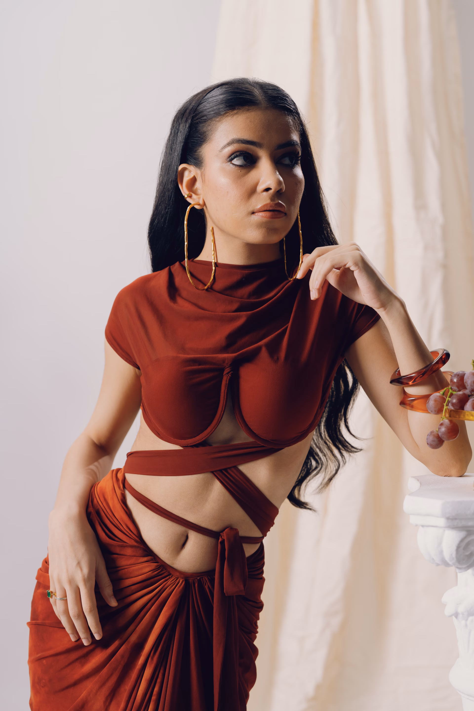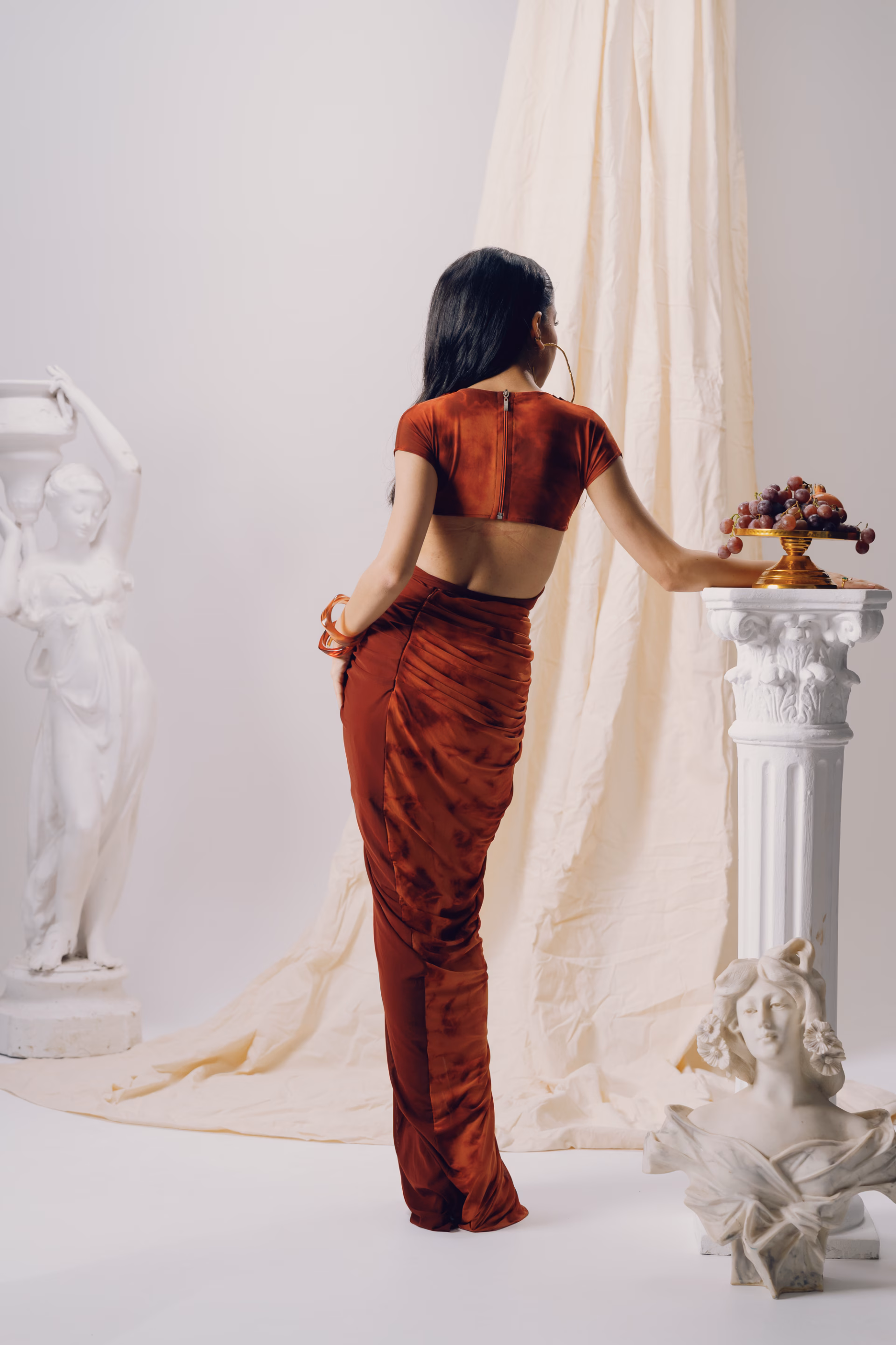 Crafted in soft power mesh, this maroon-orange tie-dye silhouette features a fluid cowl neckline and a sculpted under-bust cut enhanced by an in-built push-up bra for structure and lift. Cup sleeves frame the shoulders, while a thick tie-up belt cinches the waist to define the form. Each layer is hand-dyed using Azo-free dyes, resulting in unique tonal variations and conscious craftsmanship. A bold statement from the Genesis Pre-Fall 2025–26 collection, this piece blends sensual draping with engineered fit and mindful detailing.