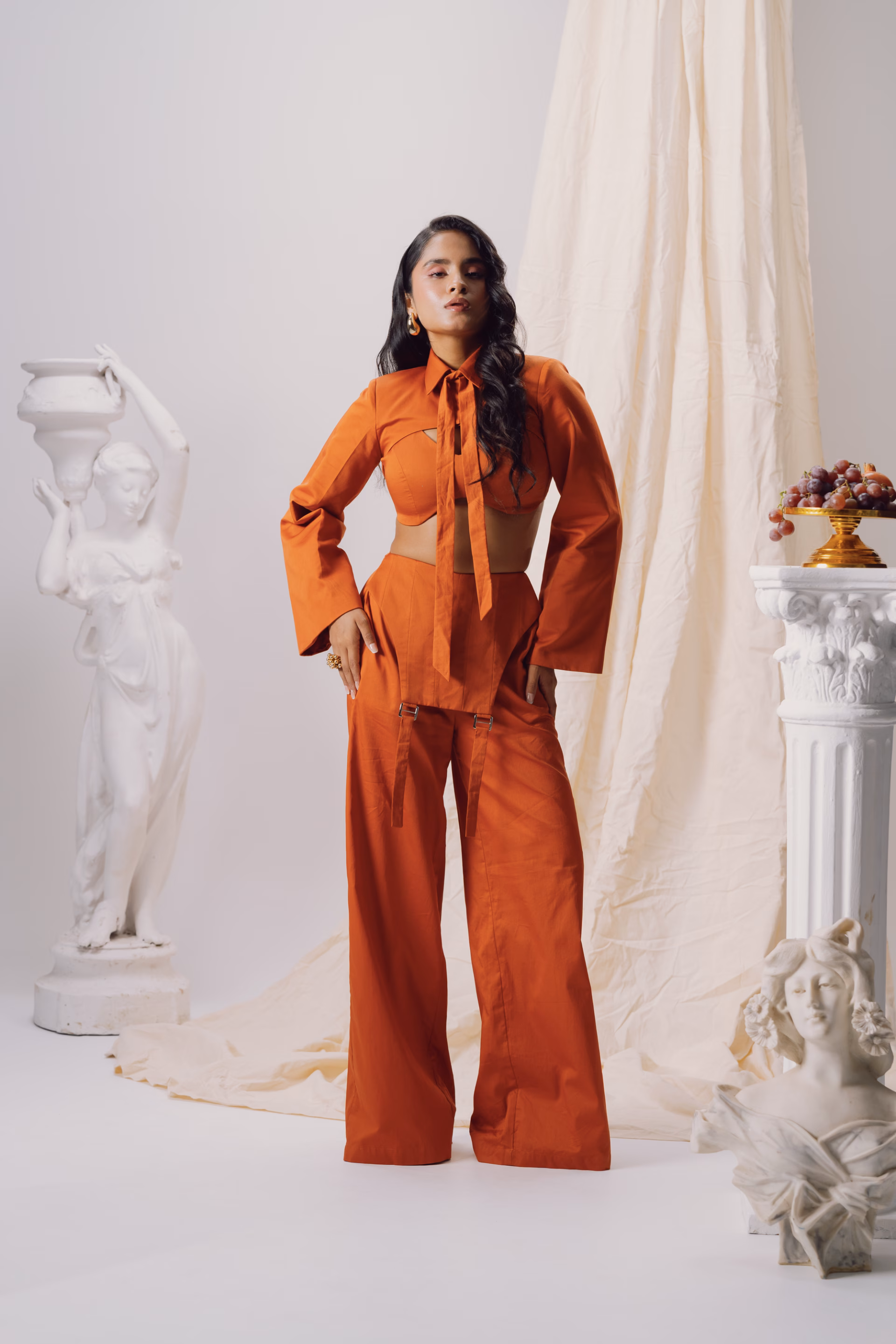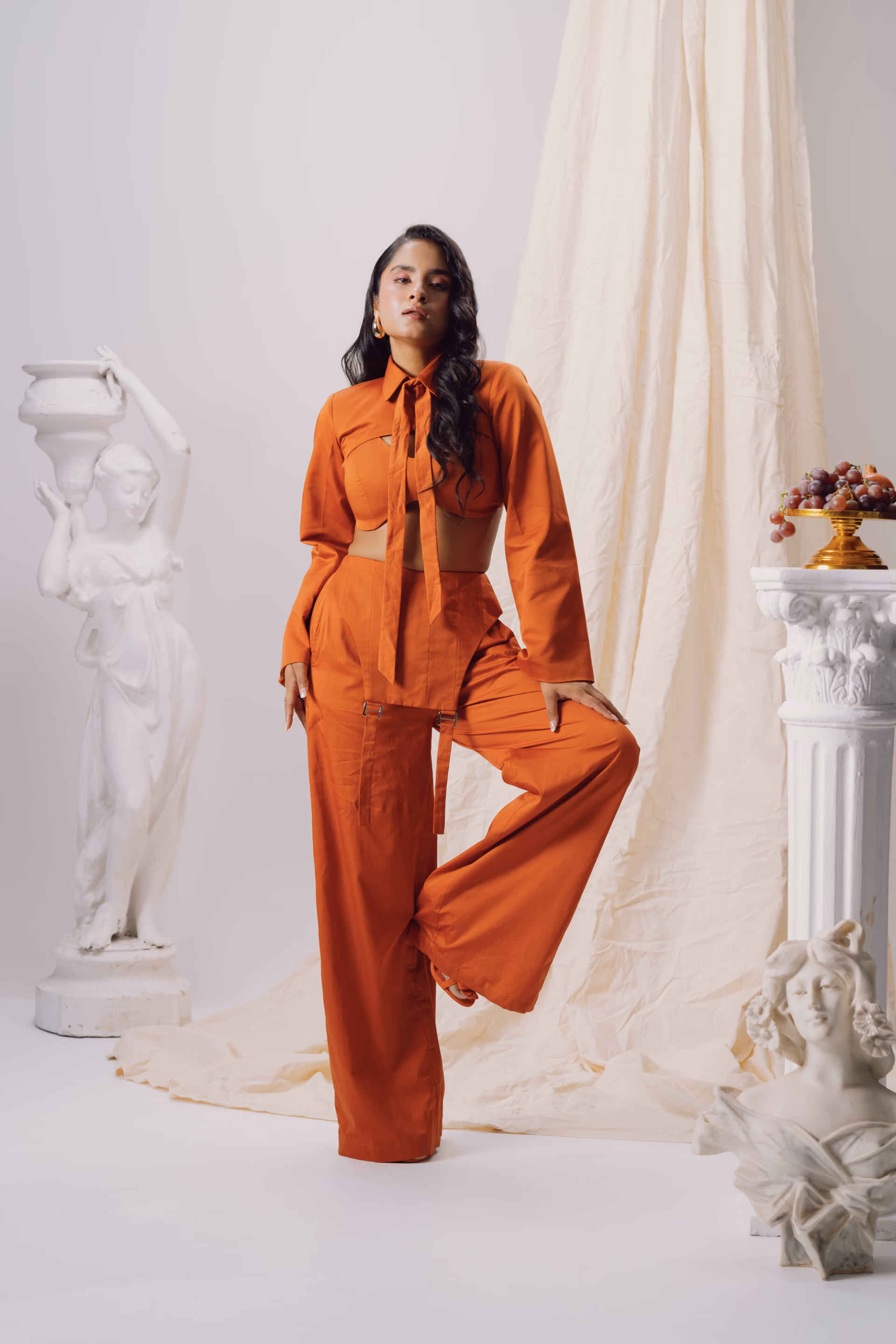This structured bralette is crafted in orange glaze cotton, featuring a sharp neckline and a contoured, padded silhouette that offers both support and structure. Designed for a clean, modern fit, it serves as a bold standalone piece or a layered foundation. A versatile staple from the Genesis Pre-Fall 2025–26 collection, blending crisp tailoring with sculptural minimalism.