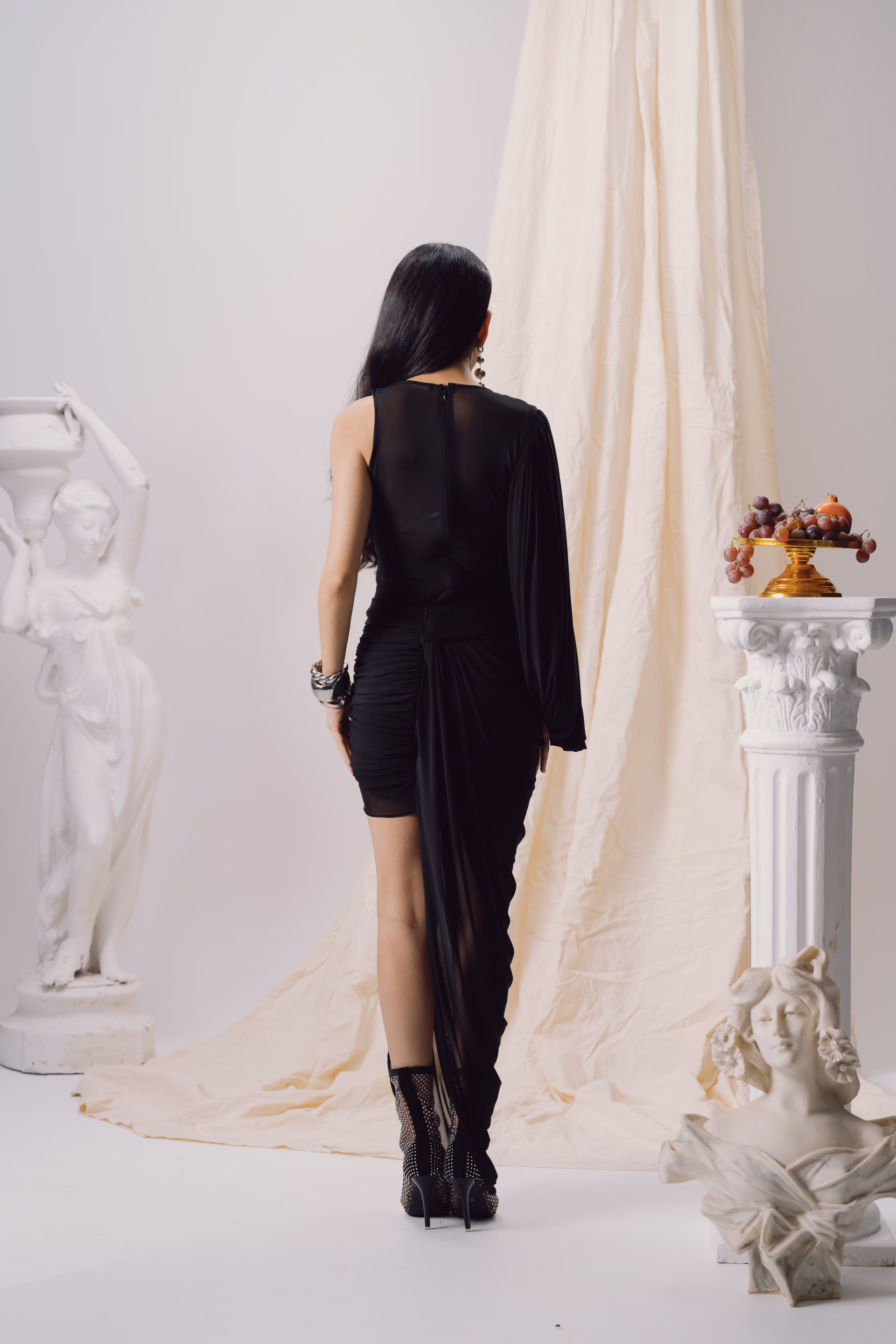 This sheer bodysuit plays with contrast and asymmetry, featuring one sleeveless side and a gathered stretch mesh sleeve on the other. A dramatic long cowl panel drape adds fluidity and sculptural depth to the silhouette. Designed for both impact and ease, the piece is finished with a concealed back zip closure. A distinctive creation from the Genesis Pre-Fall 2025–26 collection, it merges bold construction with soft, translucent textures.
