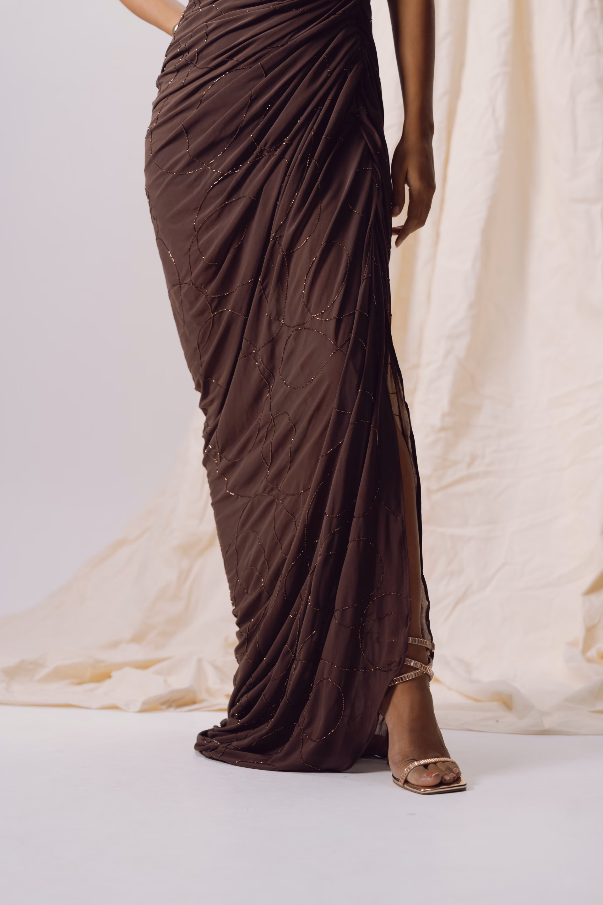 A striking one-shoulder silhouette featuring diagonal drapes throughout, this gown is crafted in stretchable mesh hand-dyed using Azo-free dyes for a conscious finish. A dramatic side slit and an elongated trail on one side enhance its fluid movement. Intricate glass bead embroidery and the collection’s signature monogram motif are meticulously handcrafted, reflecting hours of artisanal work. Each piece requires approximately 8 hours of hand embroidery, highlighting the detailed craftsmanship central to the collection. A standout piece from the Genesis Pre-Fall 2025–26 collection, it embodies elevated craftsmanship and modern couture fluidity.